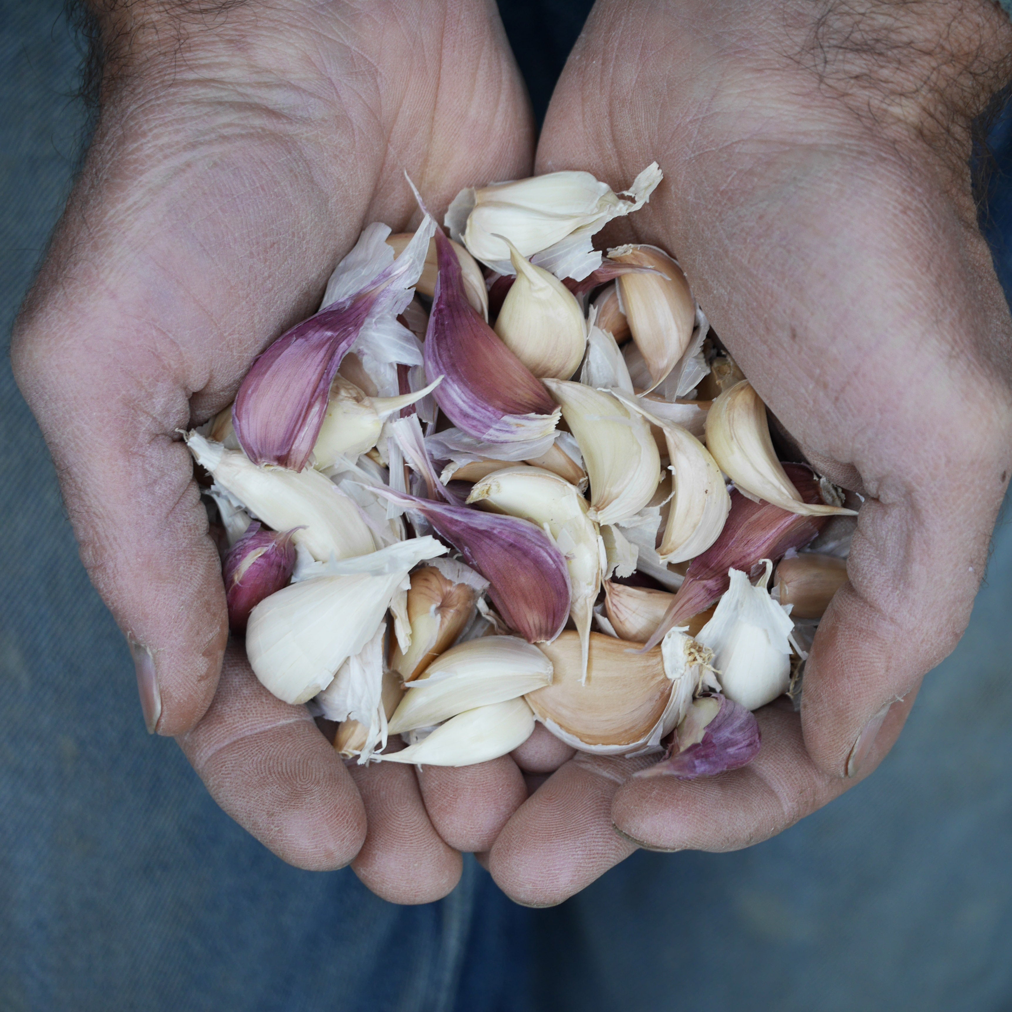 mit 10 Kilogram Knoblauch vom Bioladen. Ursula, die Verkäuferin hat uns ganz schön komisch angeschaut: "Wir hätten gerne 10 Kilo Knoblauch. - Für was denn so viel? - Hmmm, wir möchten die Knollen auf unserem Feld pflanzen. - OOOK!" Die Zehen waren so wertvoll, keins davon haben wir gegessen. Jahr für Jahr haben wir alles was wir geerntet haben wieder eingepflanzt. Momentan pflegen wir 16 Sorten Bio-Knoblauch auf 1 Hektar.